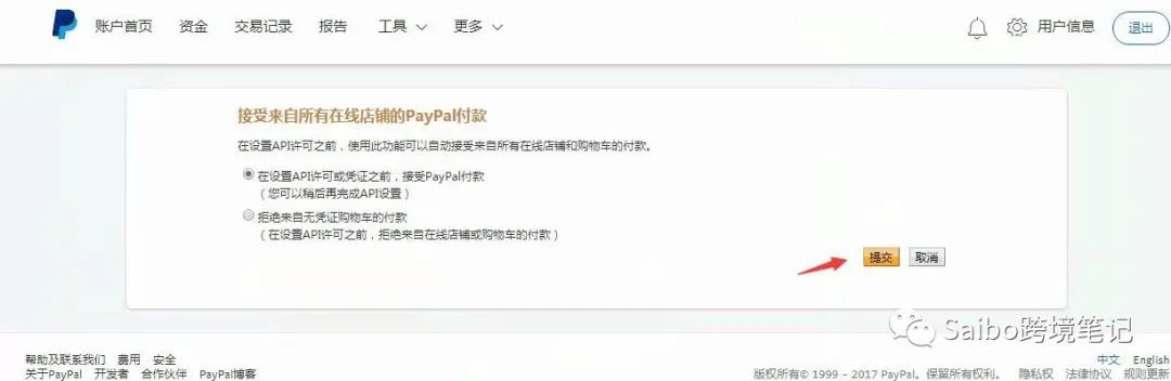 选择第一项:在设置API许可或凭证之前,接受PayPal付款(您可以稍后再完成API设置)