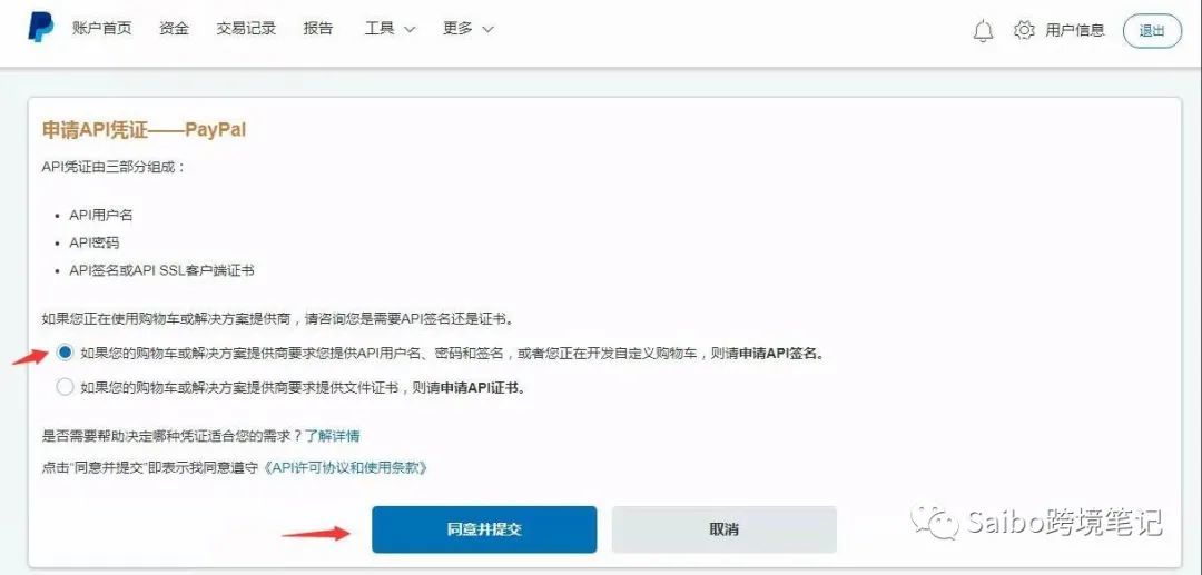 (注:若这里点击"提交"后,页面返回到了贝宝首页,请重复前面1-3步骤,到第3步时页面下拉到底部找到"管理API凭证",然后继续往下操作。)