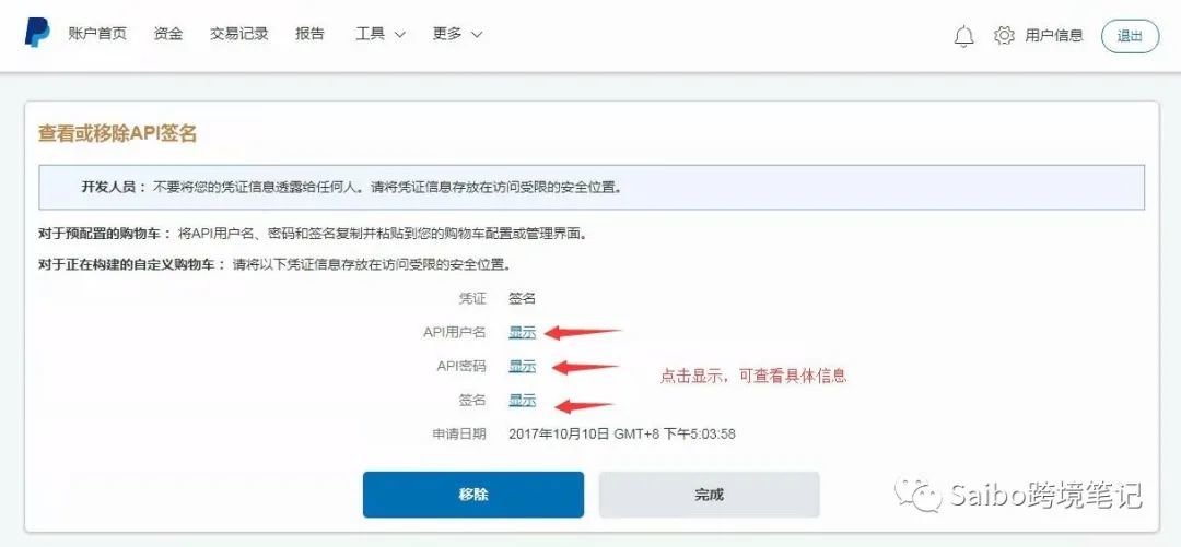 同意并提交后,跳转到下图页面,点击"显示"可查看API用户名、API密码、签名,将这3个参数记录下来后,点击完成