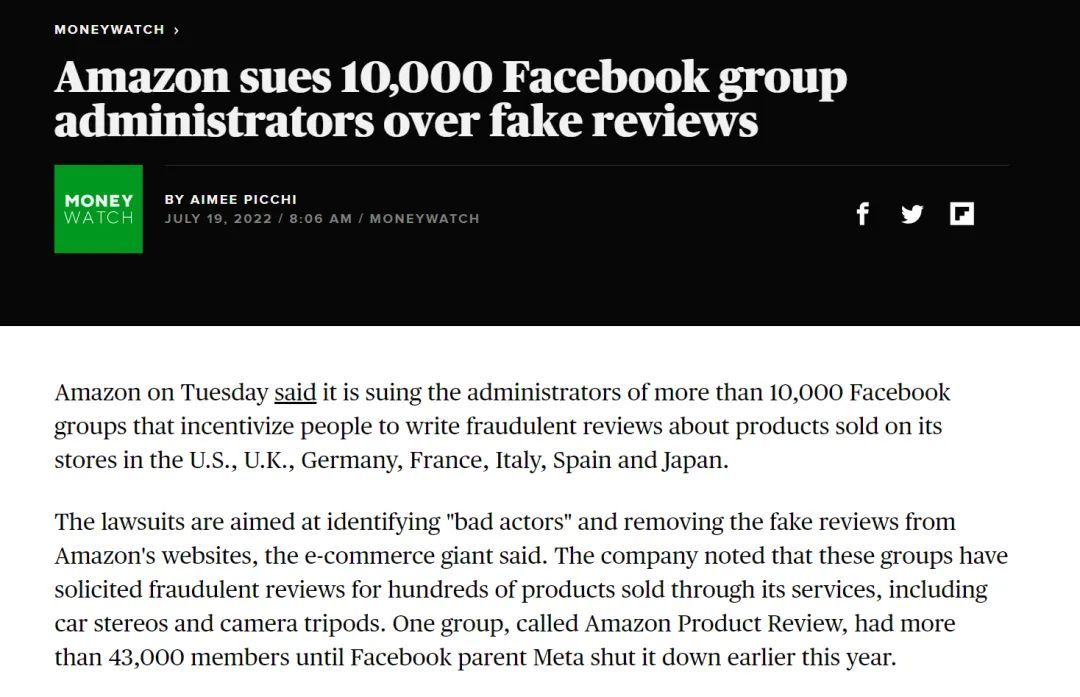 据外媒报道,就在7月19日,亚马逊官方在华盛顿州金县高级法院对1万多个Facebook群组的管理员提起诉讼。