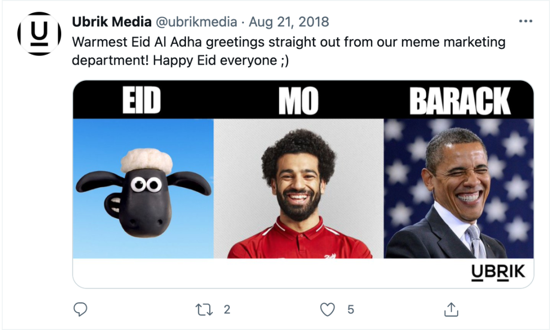 正确处理的有趣内容可以引起对您品牌的所有正确关注。比如,迪拜的 B2B 数字营销机构Ubrik Media就通过搞笑的MEME,为有趣的问候提供了案例。