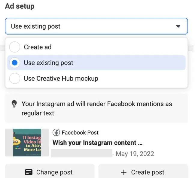如果您不确定要创建什么类型的内容,请查看您表现最好的帖子。在广告管理器中,选择现有帖子作为广告素材,以便您可以使用任何预先存在的互动来推动与您的内容的更多互动。