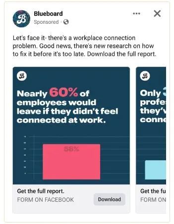 例如,下面的@blueboardinc Facebook 广告使用铅磁铁来吸引处理工作场所连接问题的潜在客户。潜在客户可以通过填写本地潜在客户表单来下载报告,而无需离开 Facebook。