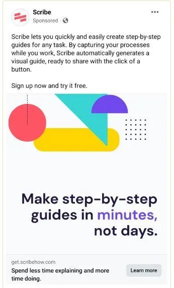 下面的@ScribeHow Facebook 广告为潜在客户提供产品预览。潜在客户可以点击注册免费试用分步指南创建工具。之后,该公司可以通过提供付费订阅来重新定位免费试用订阅者。