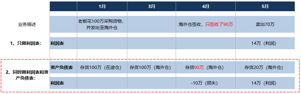 老板1月份投入了100万,买了货并运到海外仓,4月份海外仓只签收了90万,但是因为财务不做资产负债表,不知道这个情况,所以只在5月份卖出时做了14万的利润。