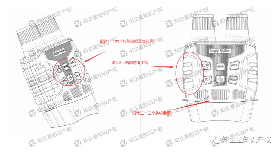 核心设计点在于:1、六个按键及其布局;2、侧面防滑手柄;3、正面的三个条纹槽。