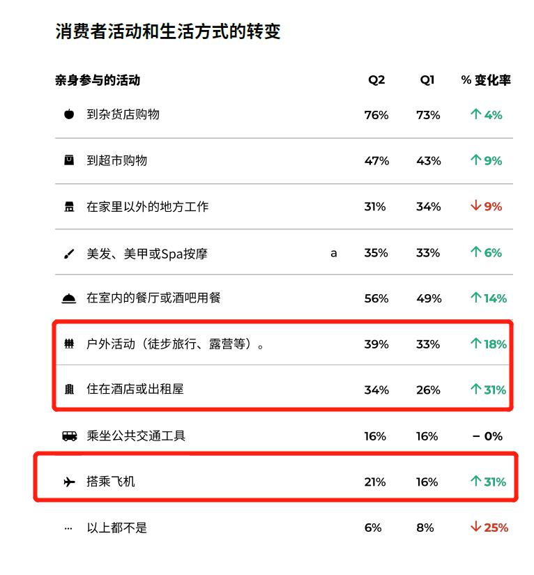 根据Jungle Scout的第二季度消费者趋势洞察报告,相比上一季度,消费者们选择户外活动、住酒店、乘坐飞机的比例上升最为明显!这一变化,又将给哪些品类带来重大的热卖机会?