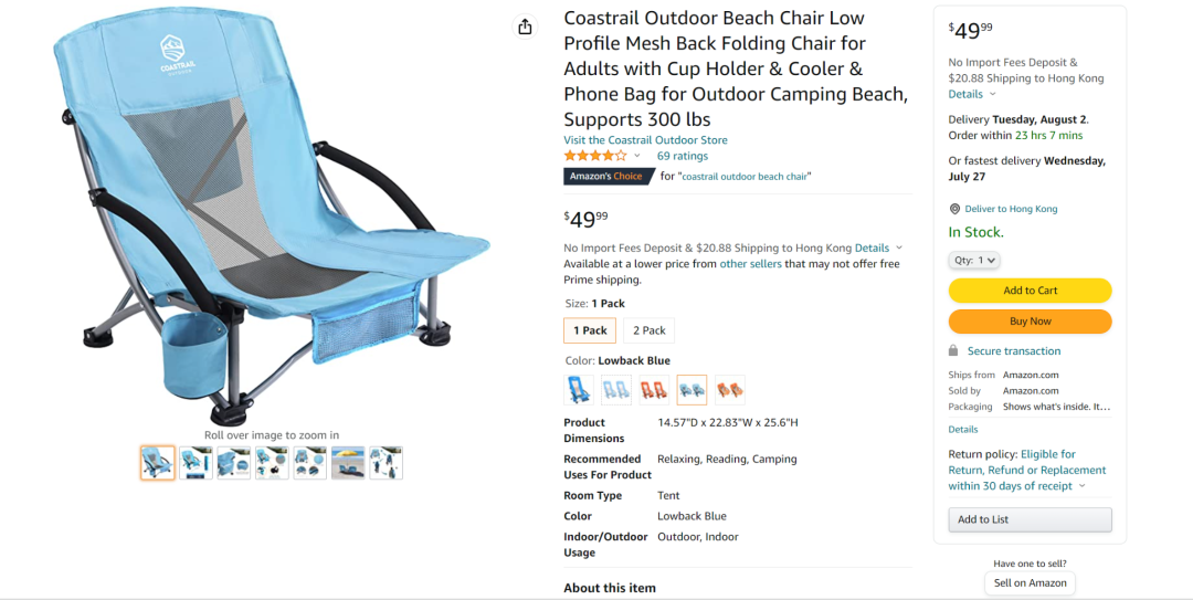 这类商品在选品时要注意舒适性、便捷性,尽可能采用较轻的材质,减少运费的同时,也可以将方便携带作为卖点。此外,扶手处需要设计拉链储物袋,用于装下人们携带至海滩的各种零碎——钱包,手机,防晒油,瓶装水,书籍杂志等等。