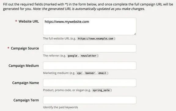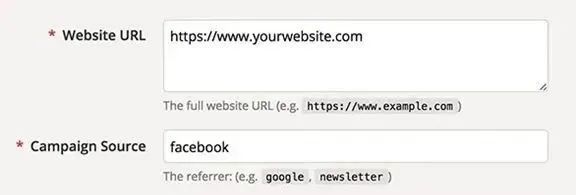 在GoogleAnalytics中跟踪Facebook营销活动的第一步是为目标广告生成URL参数。简而言之,URL参数可以收集更多信息,是衡量和跟踪性能的最有效方法之一。而构建URL参数的最佳方法是使用GoogleCampaign URL builder。