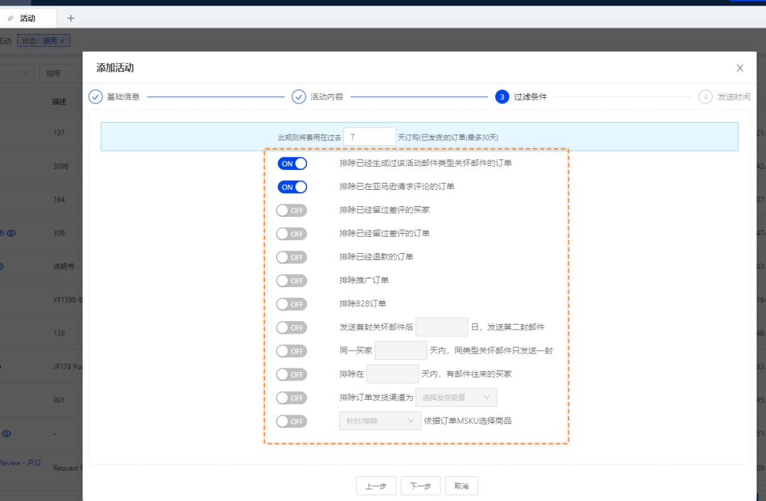 针对熟悉的订单,卖家可以在销售-销售订单,进行批量请求评论,简单快捷。在节日大促后,订单量非常大的情况下,卖家可以在客服-活动,设置过滤条件,条件设置好后就会自动请求评论,节约客服工作时间,而且还能轻松获得好评。