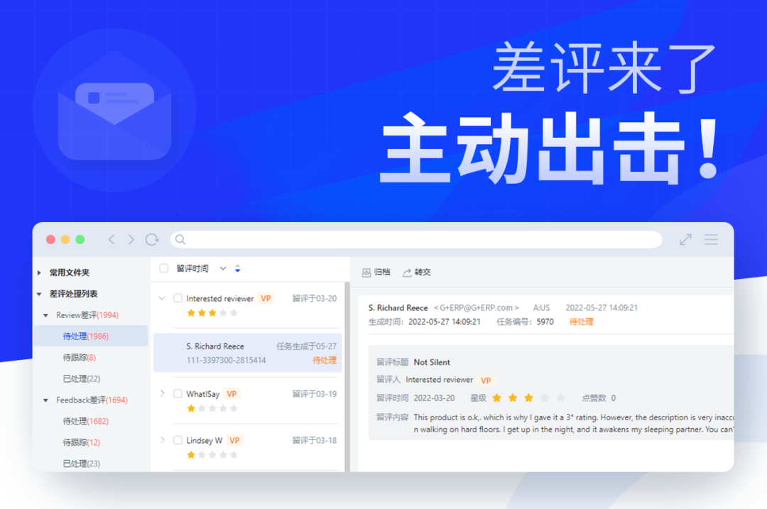 若真的产生差评,积加ERP系统会自动为新增差评匹配买家订单,匹配成功后将生成差评待处理任务推送至【差评处理列表】,提醒卖家主动发邮件和买家进行联系,及时处理差评,简单高效。