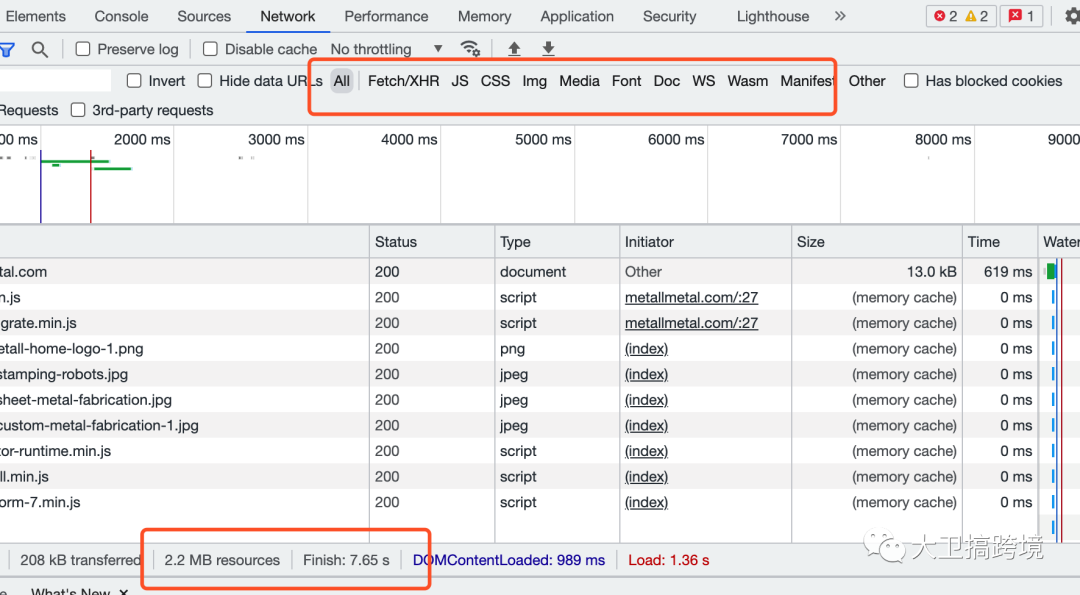 我们需要学会看网站浏览器的瀑布流,在浏览器按F12,就是当访问网站的时候加载的各种文件,哪些文件占用的带宽大,影响了网站的加载速度。