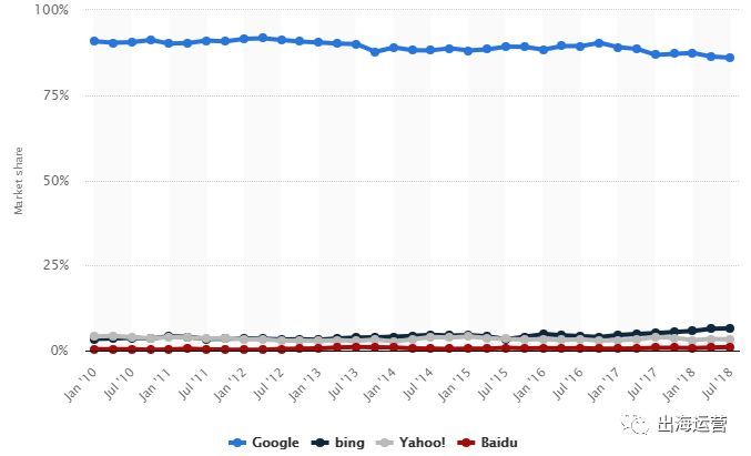 2010年1月到2018年7月全球领先搜索引擎市场占有率 在互联网世界,如果你不能被用户搜索到,你就是不存在的,因此能否利用好搜索引擎进行推广运营就显得很重要。截止2018年7月份,微软的必应搜索占据全球搜索引擎市场的6.55%的份额,而我们最常用的百度搜索在全球搜索引擎市场只占1.08%份额。谷歌搜索作为全球最大的搜索引擎,从2010年至今一直统治着搜索引擎市场,2018年7月其市场份额为86.02%,依旧是霸主级别的存在。所以只有最大程度的利用谷歌搜索曝光,才能更好将产品与服务推广触及用户并转化。谷歌的产品很多,我把谷歌的推广运营体系分为搜索引擎优化(SEO)、谷歌广告系列、Goole Blogger以及Google+。