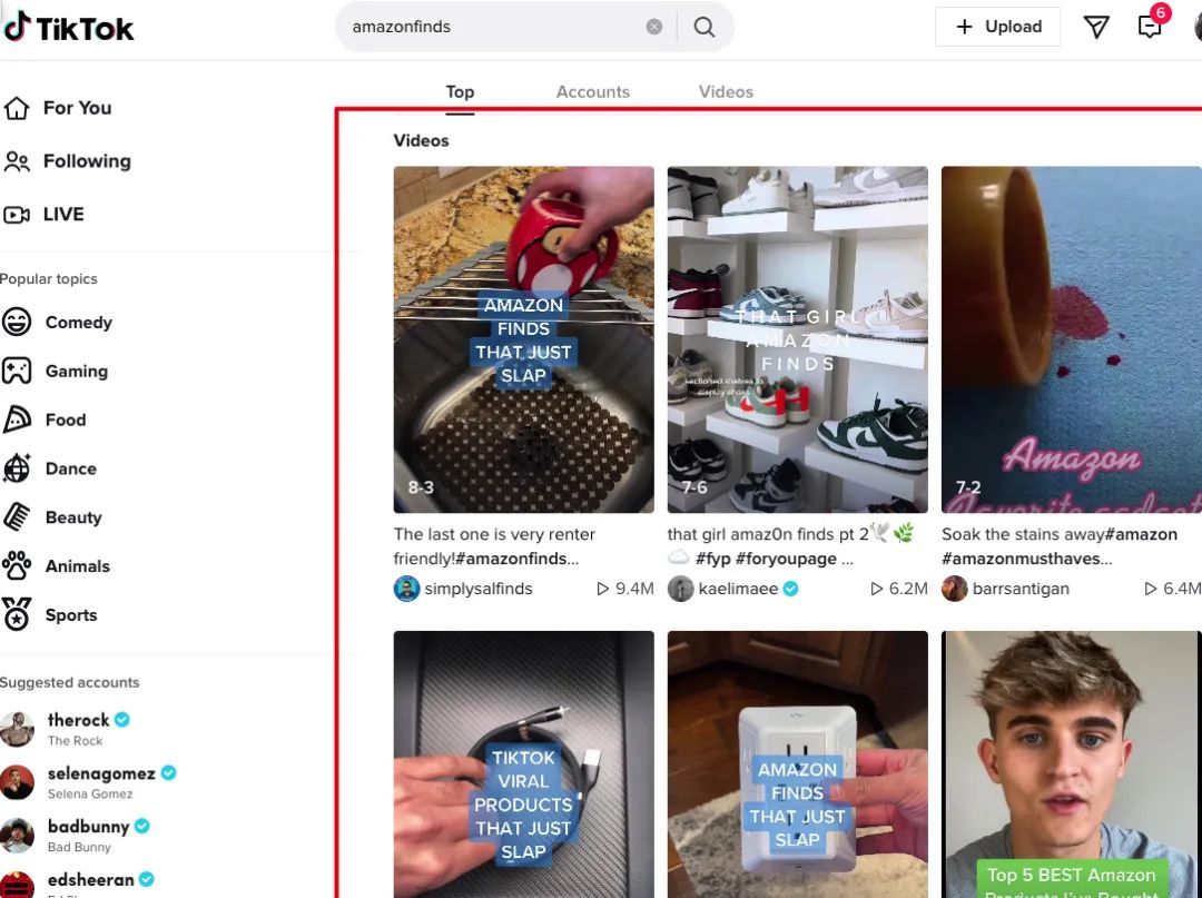 类似这种的# 非常多,我们就拿其中一个#amazonfinds 做一个案例 你直接输入tiktok 上方的搜索框 你会发现以下这么多的相关的 视频,然后tik tok 网页版比较好找,直接点击video 然后顺着往下看,看的过程中你会发现有些tiktok网红专门推亚马逊上的产品