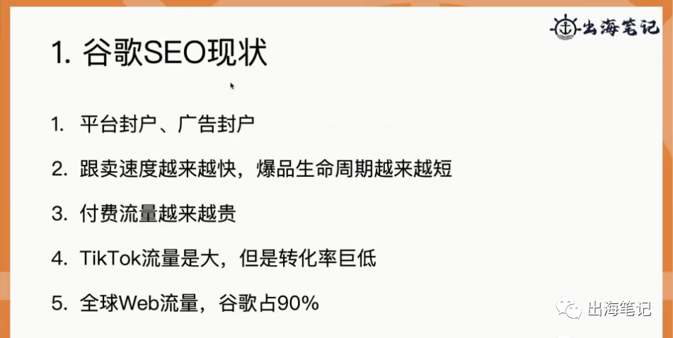 首先我将从谷歌SEO的一个现状上面来去剖析,然后从现在的一些流量渠道上来说。我们都知道从20年22年,平台封户,广告封户非常非常多。