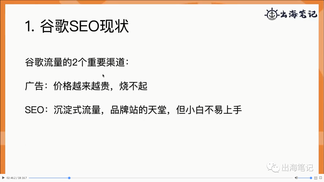 谷歌的流量渠道当中,广告我刚才也说了越来越贵,烧不起了。很有可能你两年前投的一个广告词是一美金,然后现在可能是十美金,就是翻好几倍的涨。另外一个渠道呢就是SEO。这个也是我们要讲的一个重点。SEO它是沉淀式流量,你做的越早他越香,而且越稳定。这个就非常适合我们的品牌战。但是SEO又有一个非常大的一个问题,就是我们小白不易上手。觉得SEO非常难,而且又需要去坚持。所以对于小白,我们应该怎么做呢?