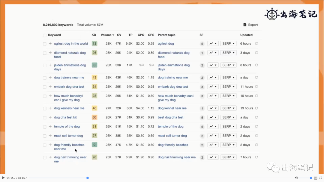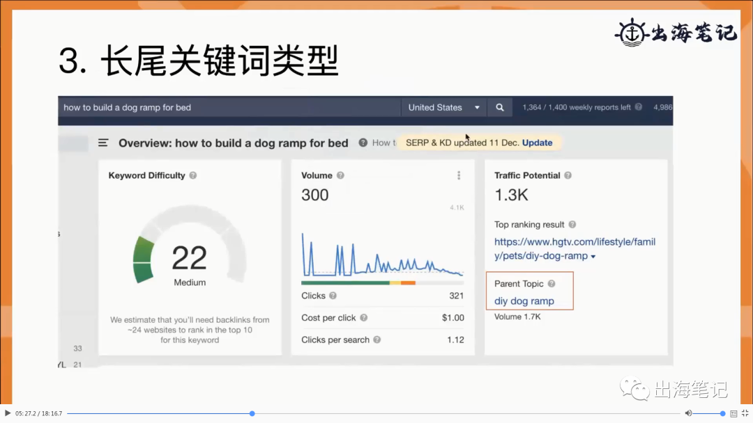比如说这个词:how to build a dog ramp for bed. 我可以看到他有一个父主题,他的父主题是diy dog。所以我们刚刚提的观念就是说他是父主题的变体,或者说父主题的长尾词。