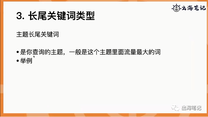 长尾词它的搜索量是很低的。但是这些长尾词往往代表着用户的搜索意图很精准。这种词它的转化又非常非常的高,所以搜索量低。我们把它称为长尾关键词。我们再来看一下长尾词的类型。这个其实是很重要的。我相信很多人其实之前应该都没有听过长尾关键词的类型,让我们来看一下。长尾关键词当中第一个类型就是支持类长尾关键词。你可以把它看作是父主题的变体,或者说父主题的长尾关键。。我们来看一下具体的案例。