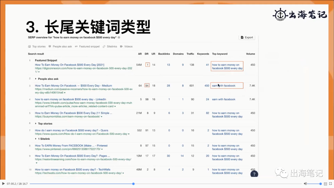 比如说我第一个是一个非常长的一个搜索词,然后底下这个earn with Facebook。可以看到他的这个搜索结果具有混合性。这种我们又把它称之为其他的关键词类型。了解了关键词类型之后我们应该去了解一下到底应该怎么去找这个长尾关键词。