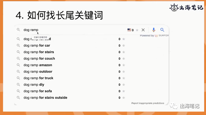 比如我们正常在谷歌的搜索框当中输入我们的关键词,然后他会给你最近用户经常搜的词,比如dog ramp。然后你想去找dog ramp A开头的所有的字,这时候就会出现Amazon。你输入f,他可能会出现dog ramp for bed, for car这种词。这个时候你只需要把这些词全部给它抓下来,或者说全部记录下来。那你就也可以获得非常多的长尾关键词。