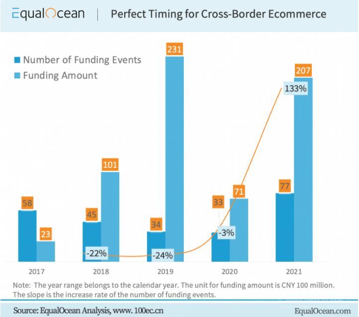 2021年内,已有五项以上跨境电商行业重大政策出台并应用到日常生活中,以更好地支持整个行业的发展。2022年伊始,又迎来了一个好消息——全国将新建27个跨境试验区。此外,融资轮次大幅增加。2021年,跨境电商融资轮数为77轮,同比增长133.33%。融资总额为207亿元,同比增长191.55%。我们相信跨境电商的最高浪潮已经到来。