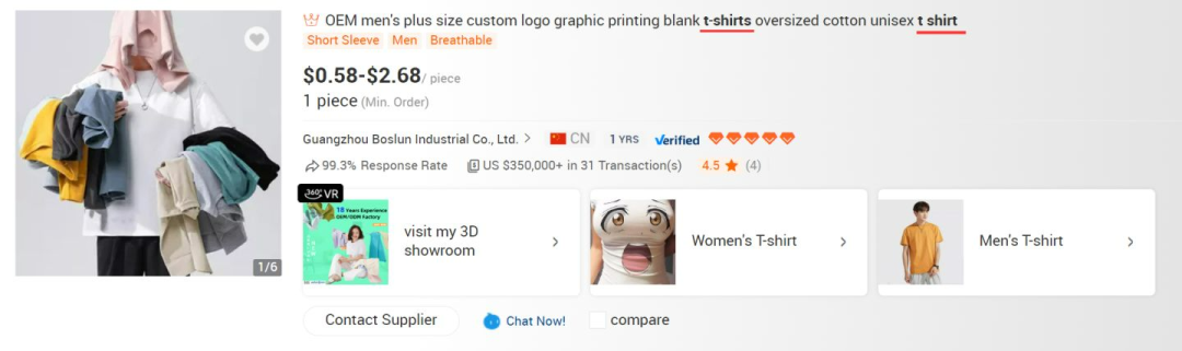 如下图,就是"t shirts"这个关键词所对应的某商家的顶展产品。
