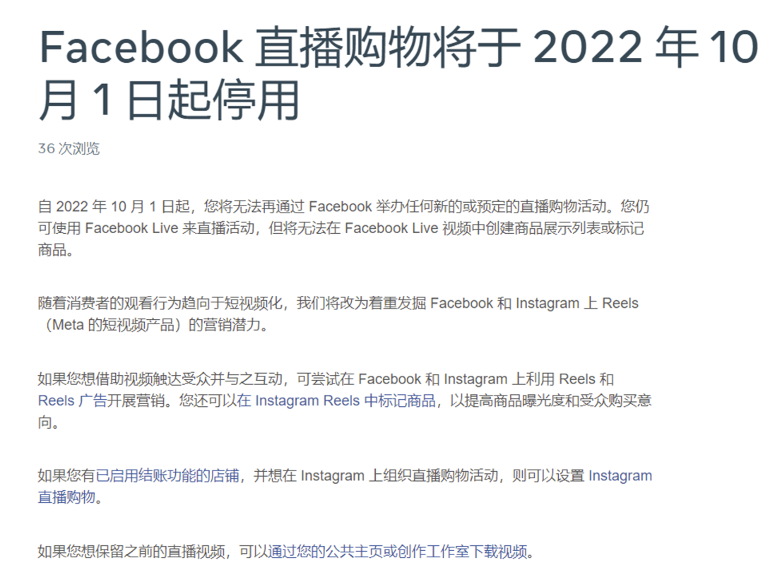 近日,Facebook发布公告称直播购物将于10月1日停用。Facebook Live直播功能仍旧可以使用,但无法在直播中创建购物列表和标签。