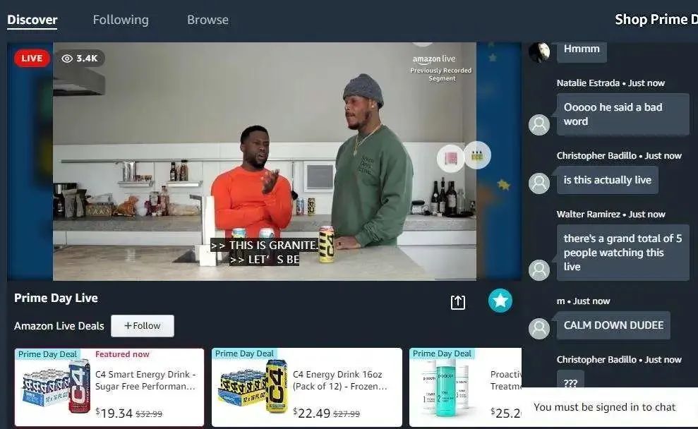 亚马逊邀请了著名喜剧演员凯文·哈特、澳大利亚超模米兰达·可儿、女演员凯尔·理查兹等明星加入Amazon Live的带货队伍。然而即便有了明星的流量加持,也未取得理想效果。会员日当天,凯文·哈特的直播间在线观看人数仅为3400人。