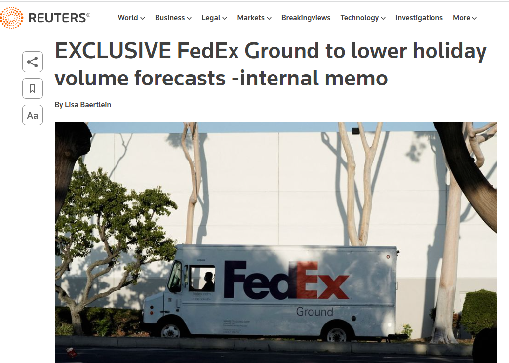 上周晚些时候,路透社的一份报告称,FedEx 的 FedEx Ground 子公司预计下季度货运量下降,预示今年的旺季包裹会减少。