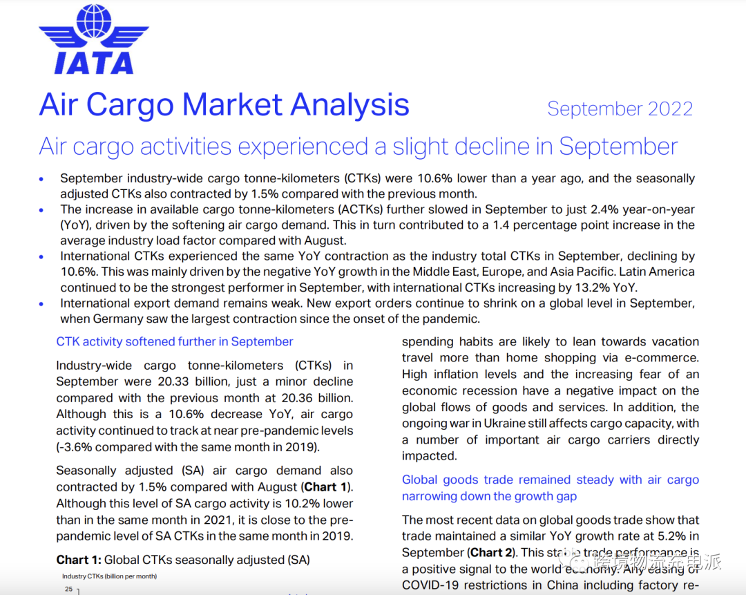 据充电文化传媒最新消息获悉,国际航空运输协会(IATA)近日发布了 2022 年 9 月全球航空货运市场报告,各项数据显示全球航空货运需求疲软,货物吨公里 (CTK) 同比下跌 10.6%,比疫情爆发前 2019 年 9 月的水平低 3.6%。