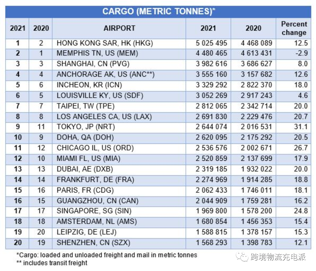 据充电文化传媒最新消息获悉,国际机场理事会 (ACI)正式整理并公布2021年全球前20大国际货运机场排名,香港国际机场取代了美国孟菲斯国际机场重回全球第一大货运机场,广州国际机场排名第16,深圳国际机场排名第20位。
