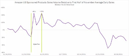 根据2021年假日季亚马逊站内广告的表现,黑五和网一仍是最关键的时期。2021年,与11月上半月的日均销售额相比,大部分卖家在黑五网一期间看到赞助产品广告产生的销售额增长45%。
