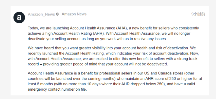 亚马逊公告原文如下:我们推出了账户健康保障(AHA),这是为持续获得高账户健康评级(AHR)的卖家提供的一项新福利。有了帐户健康保障,只要卖家与我们合作解决任何问题,我们将不再停用您的销售帐户。