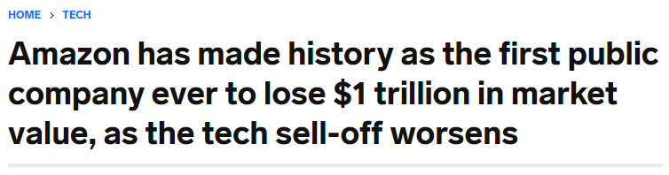 据外媒报道,在昨天亚马逊收盘时下跌4.3%,市值已经仅有8790亿美金,距离最高点的市值1.9万亿美金已经跌掉48%,成为有史以来第一家暴跌超过1万亿美元市值的上市公司。