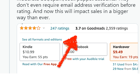 截图中的这个亚马逊电子书产品,除了显示亚马逊自己的Review情况之外,还会额外显示一家Goodreads网站的评级,Goodreads是一款第三方书评软件,曾经在13年被亚马逊收购。