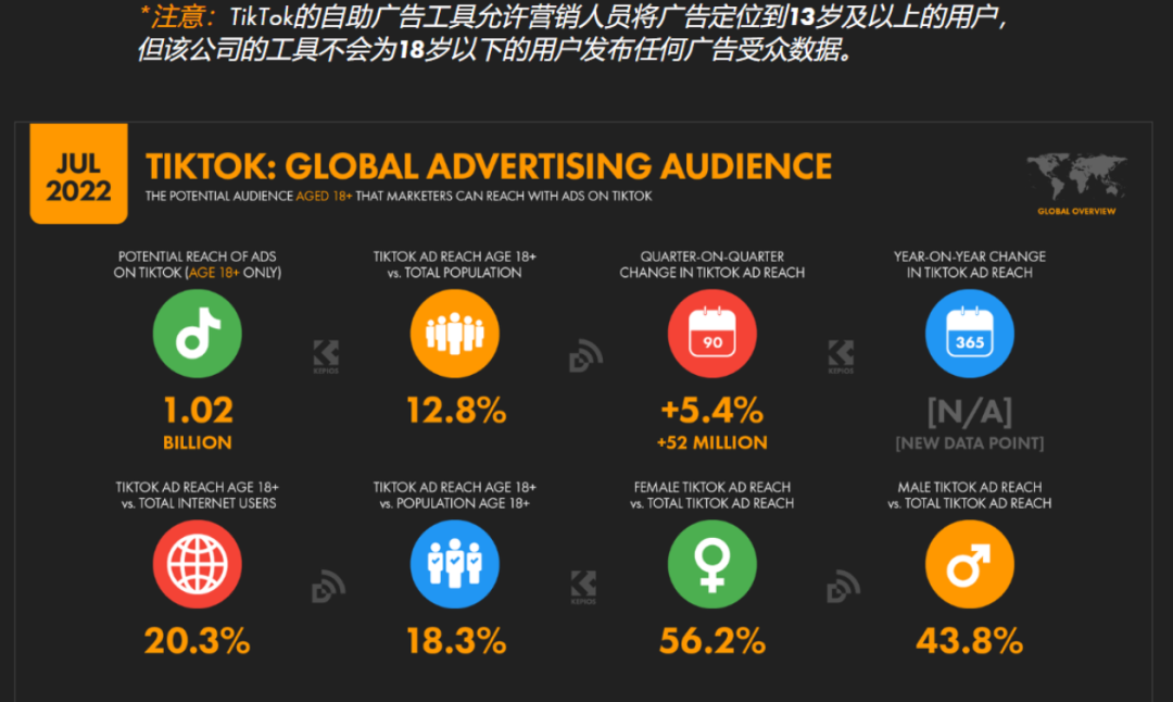 当下,TikTok全球月活数已经达12亿。据Datareport消息,2022年7月,TikTok的广告覆盖全球18岁以上用户数量已达10.23亿,相当于全球人口的12.8%。