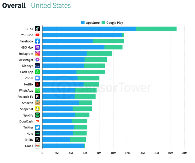 自2021年Q1起,TikTok每个季度都是全美排名下载量第一的应用。来源:Sensor Tower