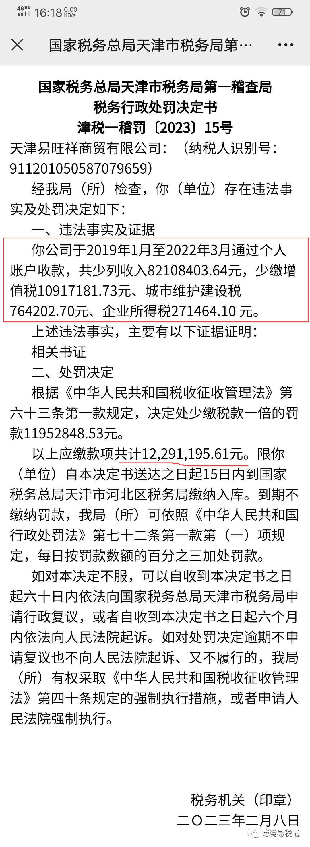 以上应缴款项共计12,291,195.61元。限你(单位)自本决定书送达之日起15日内到国家税务总局天津市河北区税� ��局缴纳入库。到期不缴纳罚款,我局(所)可依照《中华人民共和国行政处罚法》第七十二条第一款第(一)项规定,每日按罚款数额的百分之三加处罚款。