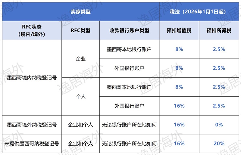 2026年1月1日 起,墨西哥税务局(SAT)要求电商平台亚马逊、美客多等对在墨西哥站点产生的交易实行代扣所得税(ISR)和增值税(IVA)。