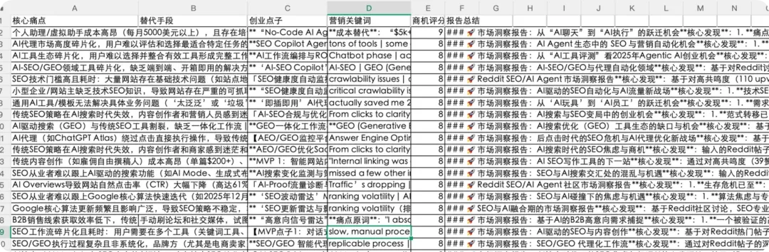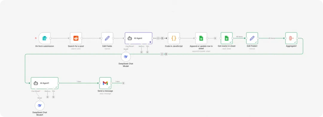 通过表单填写你的产品关键词,然后通过Reddit节点来search你的关键词,找到Reddit上所有跟你关键词相关的Post,比如说50个post,然后交给AI Agent统一进行处理分析找出痛点以及商业机会,你可以把这些痛点和商机统一上传到Google Sheet,自己一个个的看。