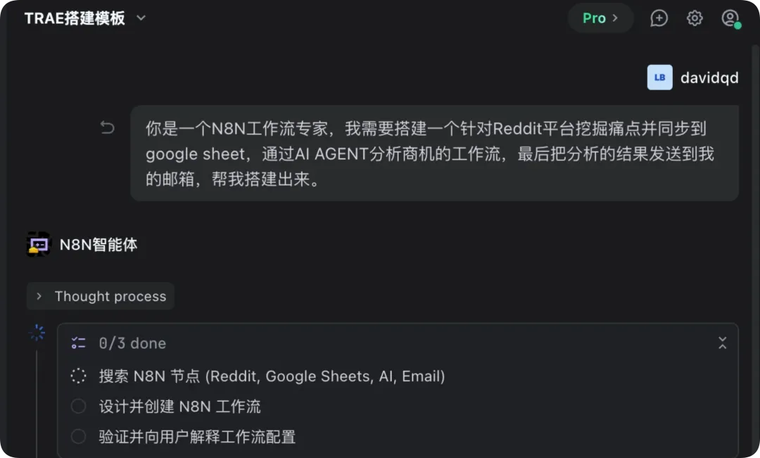 最主要的是这个N8N的AI Agent工作流也是全自动搭建,很多人上手N8N觉得困难,看到这么多节点,不知道该怎么用,也不知道如何处理流程的逻辑问题,很简单,直接使用AI工作流搭建Agent-TRAE