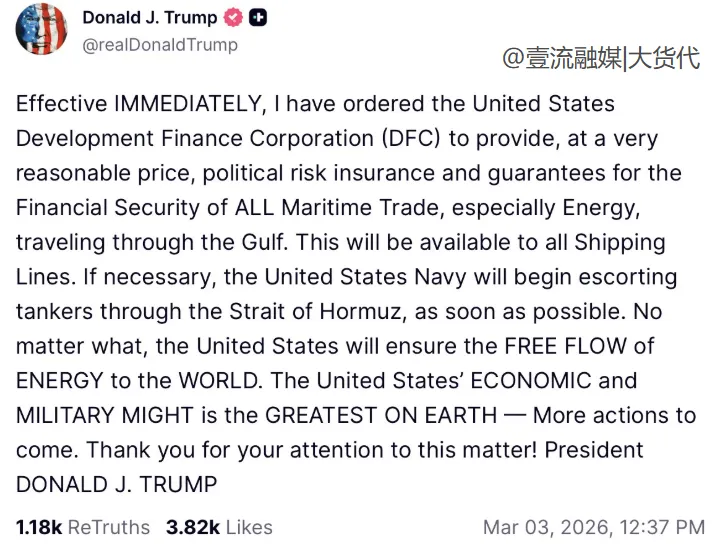 据悉,在当地时间3月3号,美国总统特朗普在其真相社交(truthsocial)平台上表示,他已下令为海湾航运提供保险担保,同时暗示可能派遣海军油轮护航!