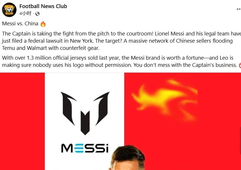 周末刷信息流发现:海外媒体报导,梅西团队指控中国跨境卖家大规模生产、销售假冒"MESSI"商标商品,涉嫌商标侵权与不正当竞争。