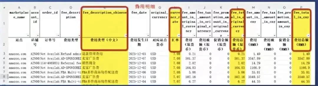 费用明细表是按站点分别统计的,包含了平台佣金、FBA仓储费、广告费、配送费等各类费用,费用类型相当齐全。但这张表有一个特点:费用是按站点汇总的,不是按SKU拆分的,需要你自己完成SKU的匹配工作,这也是很多卖家觉得麻烦的地方。