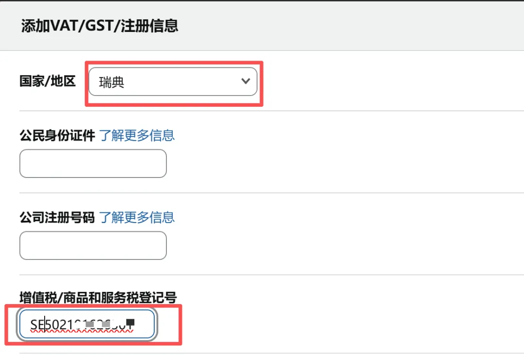 第三步:瑞典VAT添加位置如下:【添加VAT/GST/注册信息】